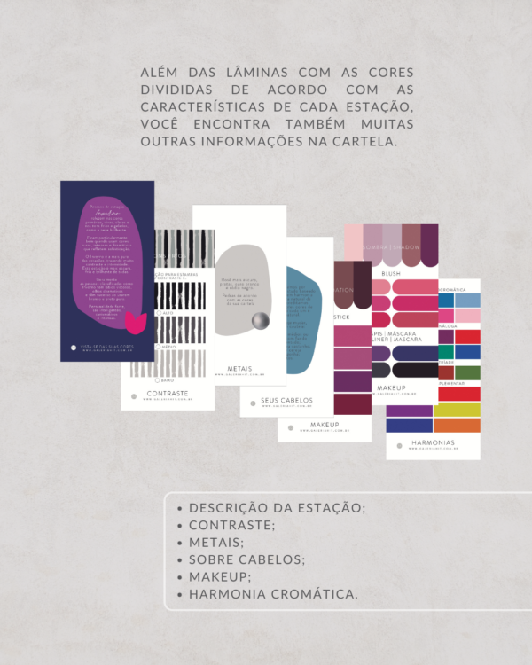 Nosso material possui em cada lâmina 03 (três) subdivisões que se referem ao Método Sazonal Expandido, com uma característica principal e duas secundárias, reforçando a importância em estar na Estação certa, mas que as intensidades e profundidades de cada cartela não alteram a beleza da pessoa com tais cores, uma vez que na natureza não há erro e todas as cores se harmonizam.