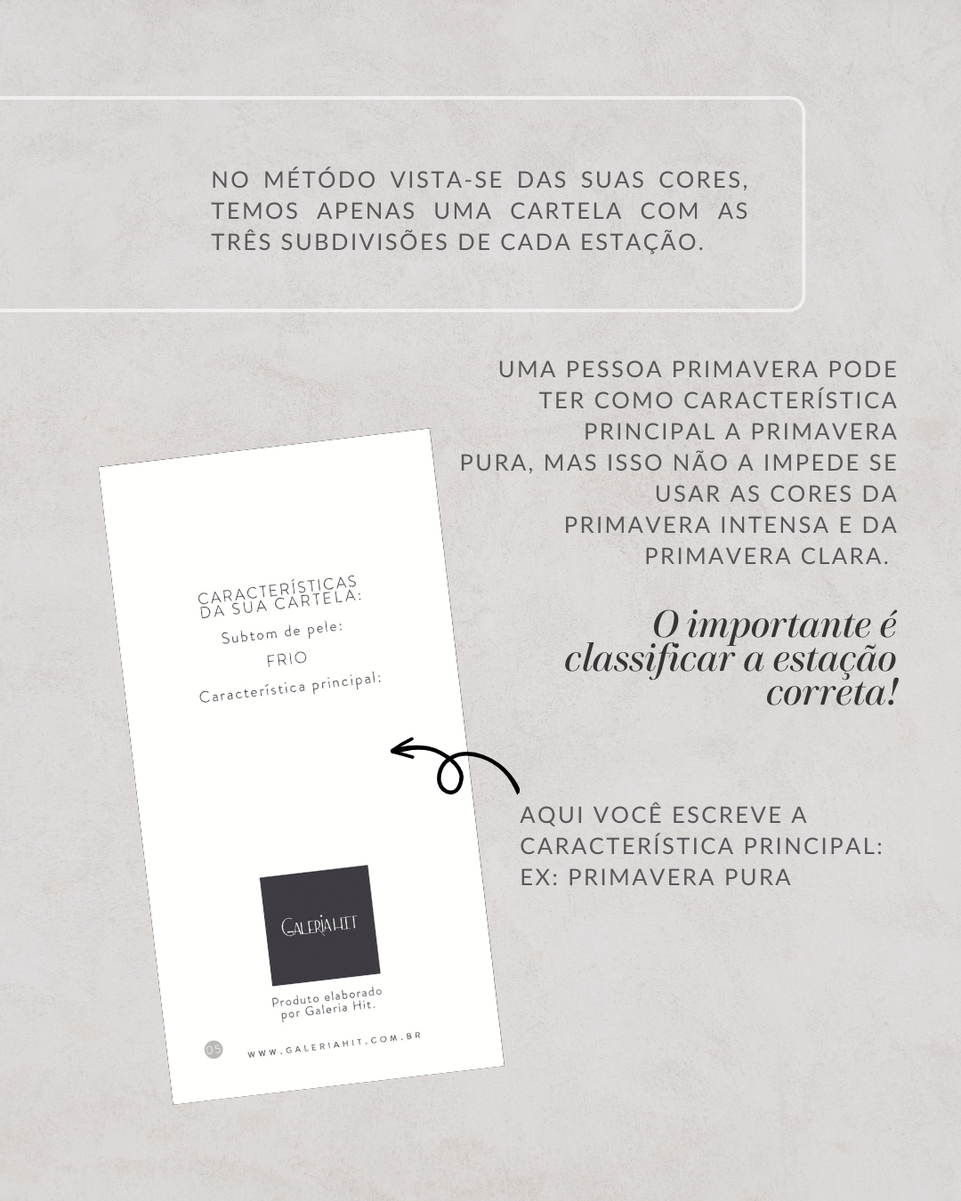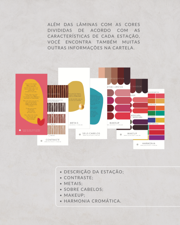 Nosso material possui em cada lâmina 03 (três) subdivisões que se referem ao Método Sazonal Expandido, com uma característica principal e duas secundárias, reforçando a importância em estar na Estação certa, mas que as intensidades e profundidades de cada cartela não alteram a beleza da pessoa com tais cores, uma vez que na natureza não há erro e todas as cores se harmonizam.