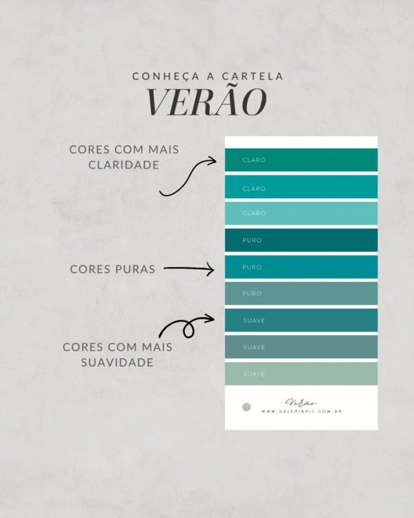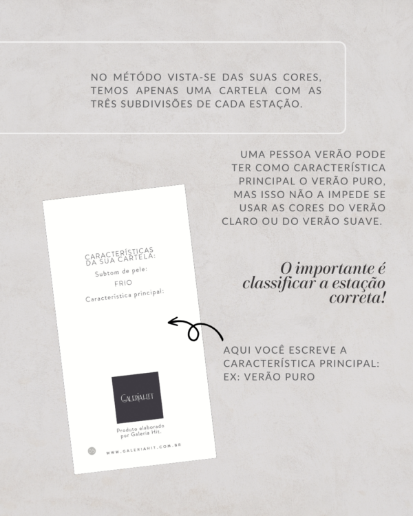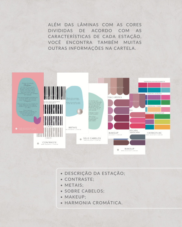 Nosso material possui em cada lâmina 03 (três) subdivisões que se referem ao Método Sazonal Expandido, com uma característica principal e duas secundárias, reforçando a importância em estar na Estação certa, mas que as intensidades e profundidades de cada cartela não alteram a beleza da pessoa com tais cores, uma vez que na natureza não há erro e todas as cores se harmonizam.